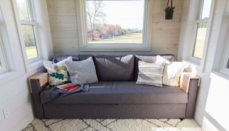 Một chiếc sopha cỡ vừa tối màu được đặt chính xác vào góc của ngôi nhà di động với tầm nhìn qua các cánh cửa sổ dễ chịu.