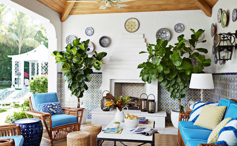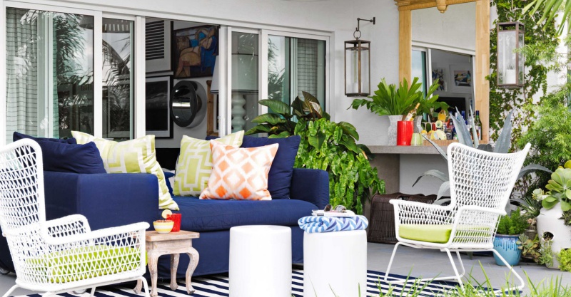 Khi khoảng sân trước nhà đủ rộng rãi để bạn bài trí chức năng tiếp khách, chuyện trò, bạn có thể tạo những mảng màu đặc biệt và đậm đà như màu xanh biển đậm, màu xanh lá, thêm họa tiết kẻ của thảm để góc thư giãn nhìn tổng thể được hài hòa và cá tính.