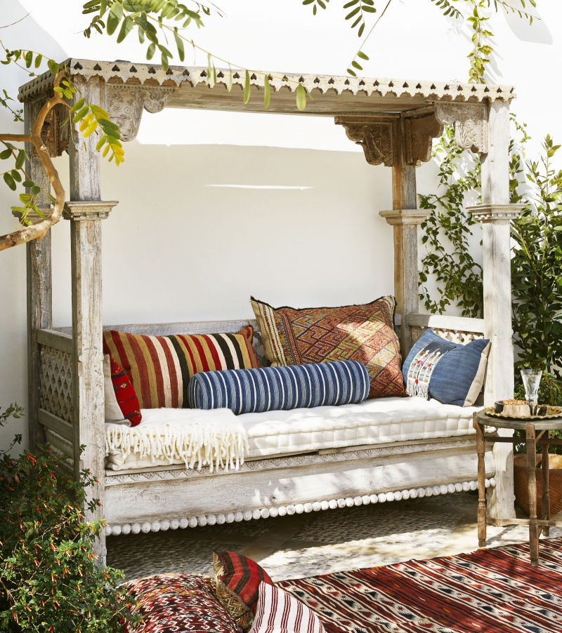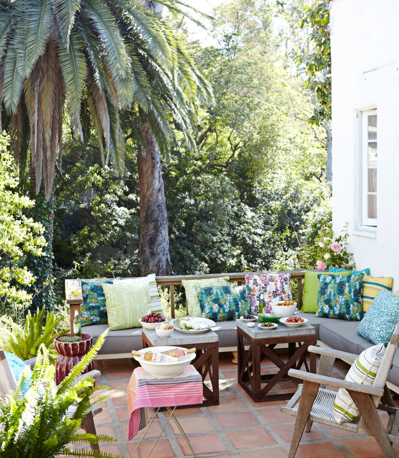 Đặt những chiếc gối ôm họa tiết bắt mắt, chúng sẽ đánh thức thị giác, giúp cho không gian thư giãn ngoài trời đẹp bất ngờ mà không cần sử dụng quá nhiều nội thất đắt tiền.