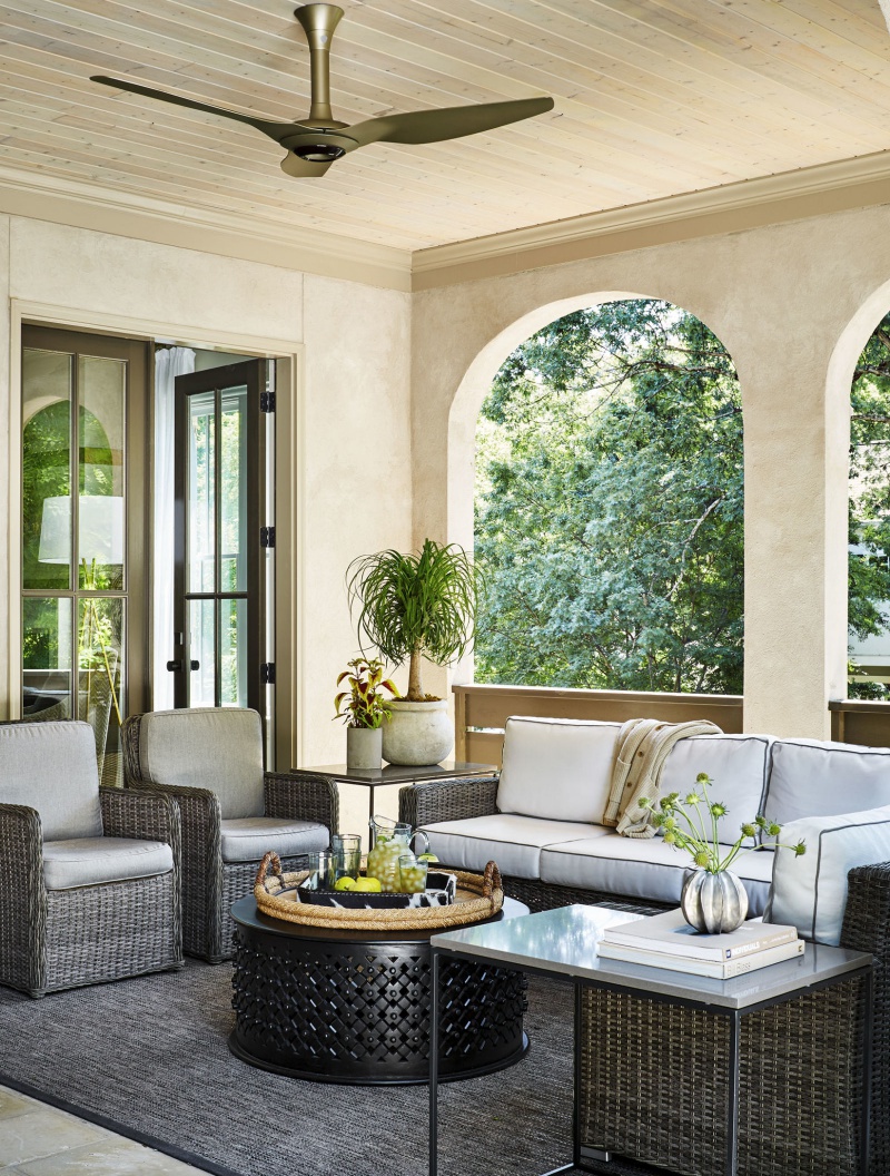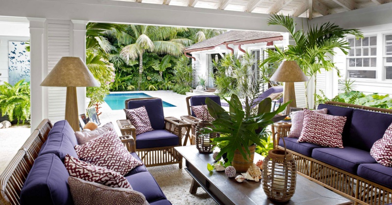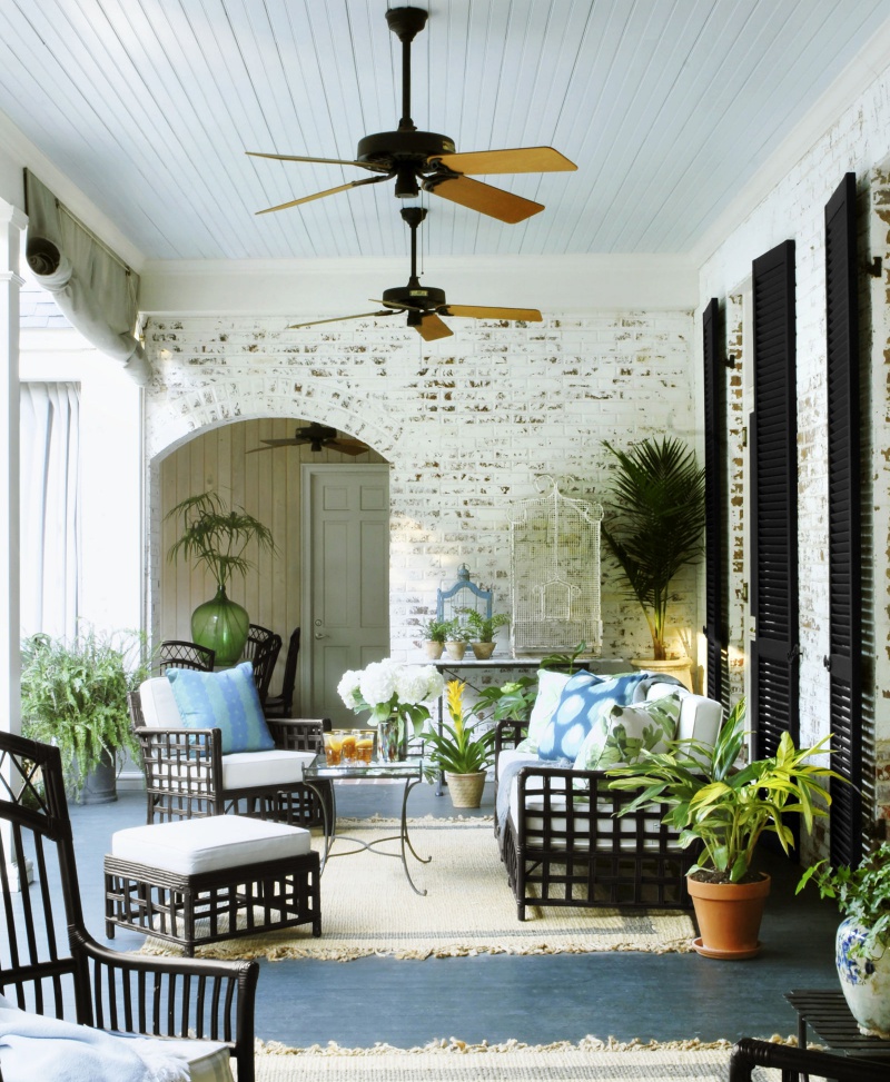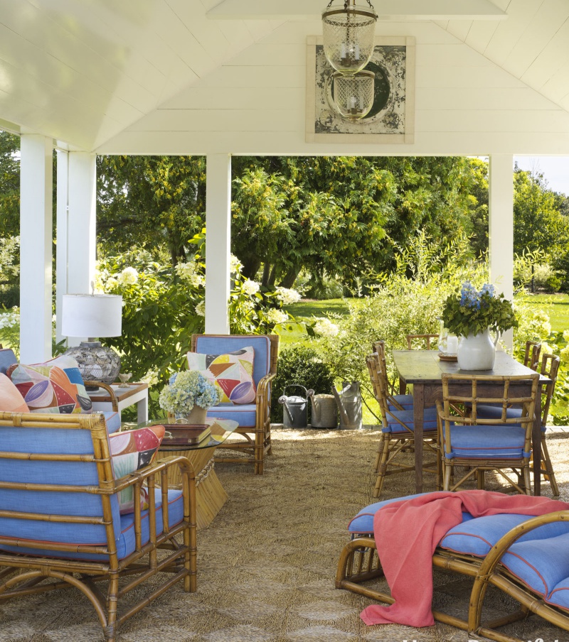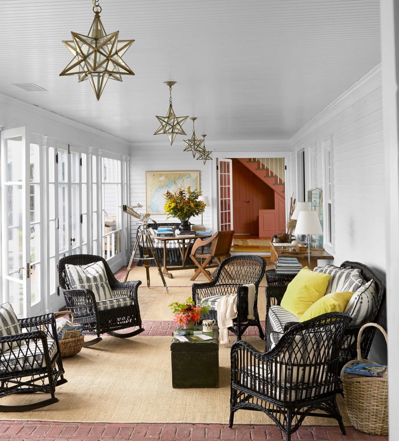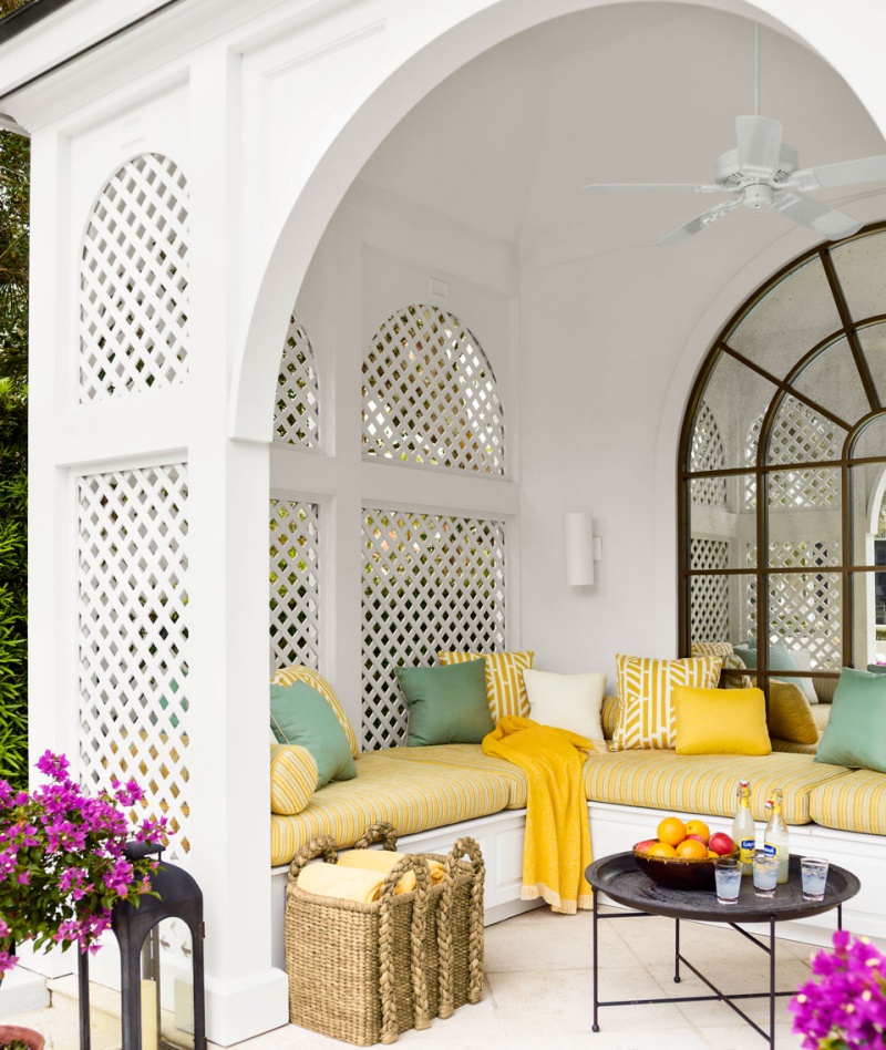 Xung quanh hiên nhà được trang trí với tông màu trắng sáng thì nệm và gối tựa có thể dùng những màu đối lập, màu gần với thiên nhiên như xanh hay vàng, vừa giúp không gian tươi tắn hơn vừa tạo cảm giác vui vẻ cho mọi người khi sử dụng.