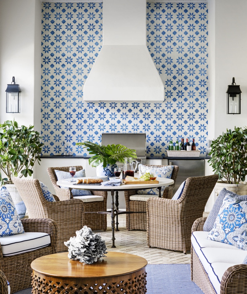 Một góc sân sẽ trở thành nơi thư giãn đặc biệt với vẻ đẹp phảng phất phong cách Địa Trung Hải khi được sử dụng thảm họa tiết với màu sắc bắt mắt.