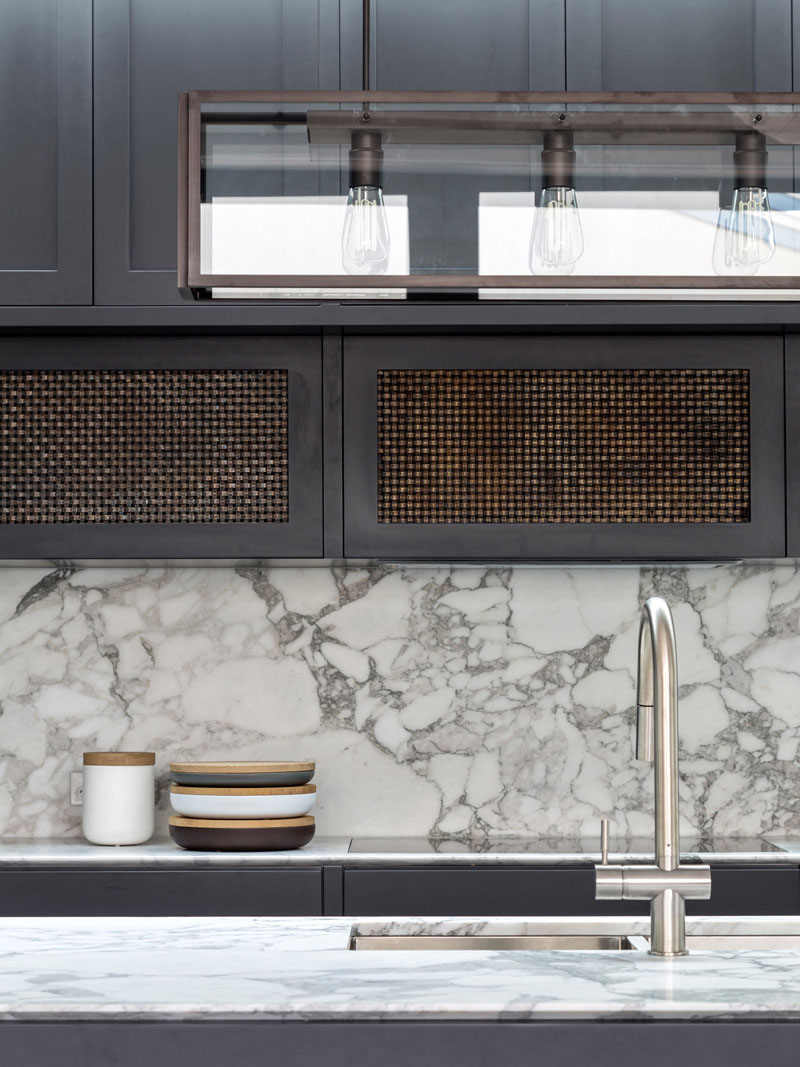 Sự kết hợp giữa đảo bếp và mặt bàn bằng đá cẩm thạch với tủ bếp xanh lam đậm mang đến vẻ đẹp hiện đại, tinh tế cho căn bếp.