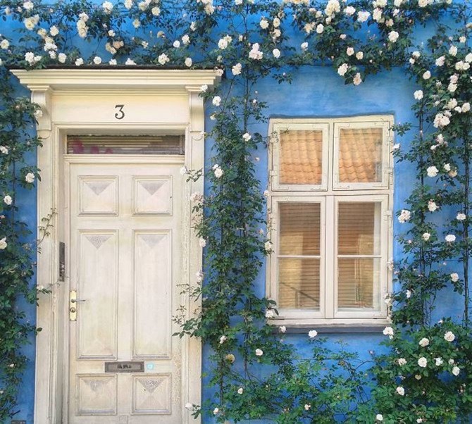 Bất kỳ ai khi đi ngang qua những ngôi nhà này, chắc chắn đều phải đi chầm chậm, hoặc dừng lại để ngắm nhìn vẻ đẹp quyến rũ của những khóm hồng leo với màu xanh mướt mát, điểm tô trên nền xanh của lá cây và của tường là những bông hồng nhỏ xíu màu trắng như những ngôi sao dịu dàng, tỏa sáng trên bầu trời. Và quan trọng hơn, gia chủ đã rất khéo léo khi trồng hồng cùng tông màu với khung cửa sổ và cửa chính, tạo nên bức tranh đẹp lãng mạn cho không gian ngoại thất.