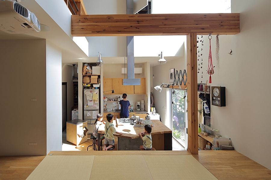 Nhà bếp thì có nền thấp hơn khoảng 90 phân, cũng sử dụng chất liệu gỗ. Theo tính toán, chủ nhân đã không dùng vách ngăn hay tường bao hai không gian này lại với mục đích, người mẹ khi ở trong bếp vẫn có thể chăm sóc các con chơi trên phòng khách và ngược lại. Đồng thời, tạo không gian mở thoáng cho ngôi nhà.