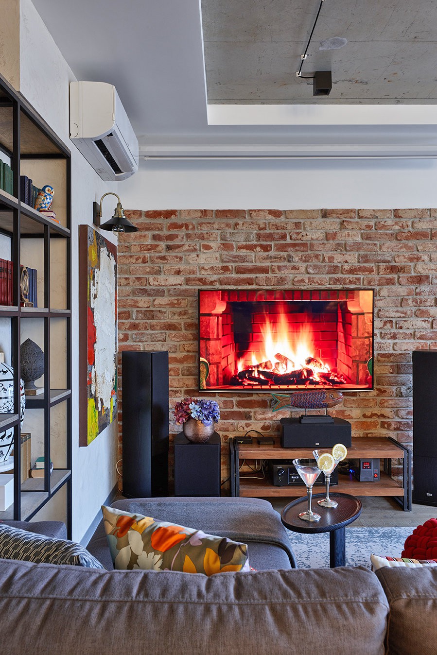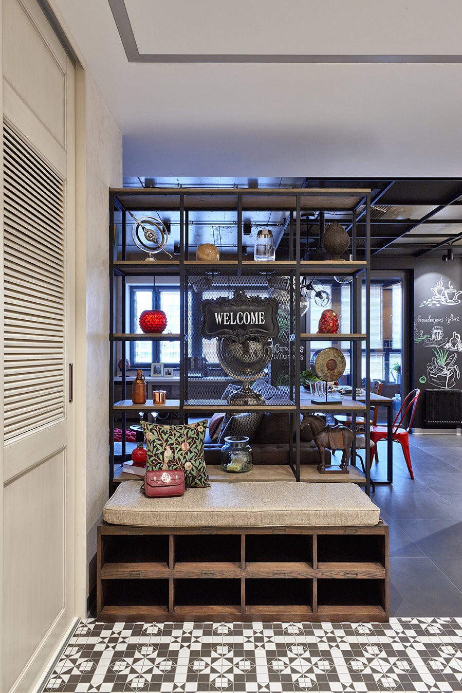 Không gian phòng khách được sắp xếp bộ sofa màu xám, ngăn cách với không gian từ cửa vào bằng kệ kim loại.